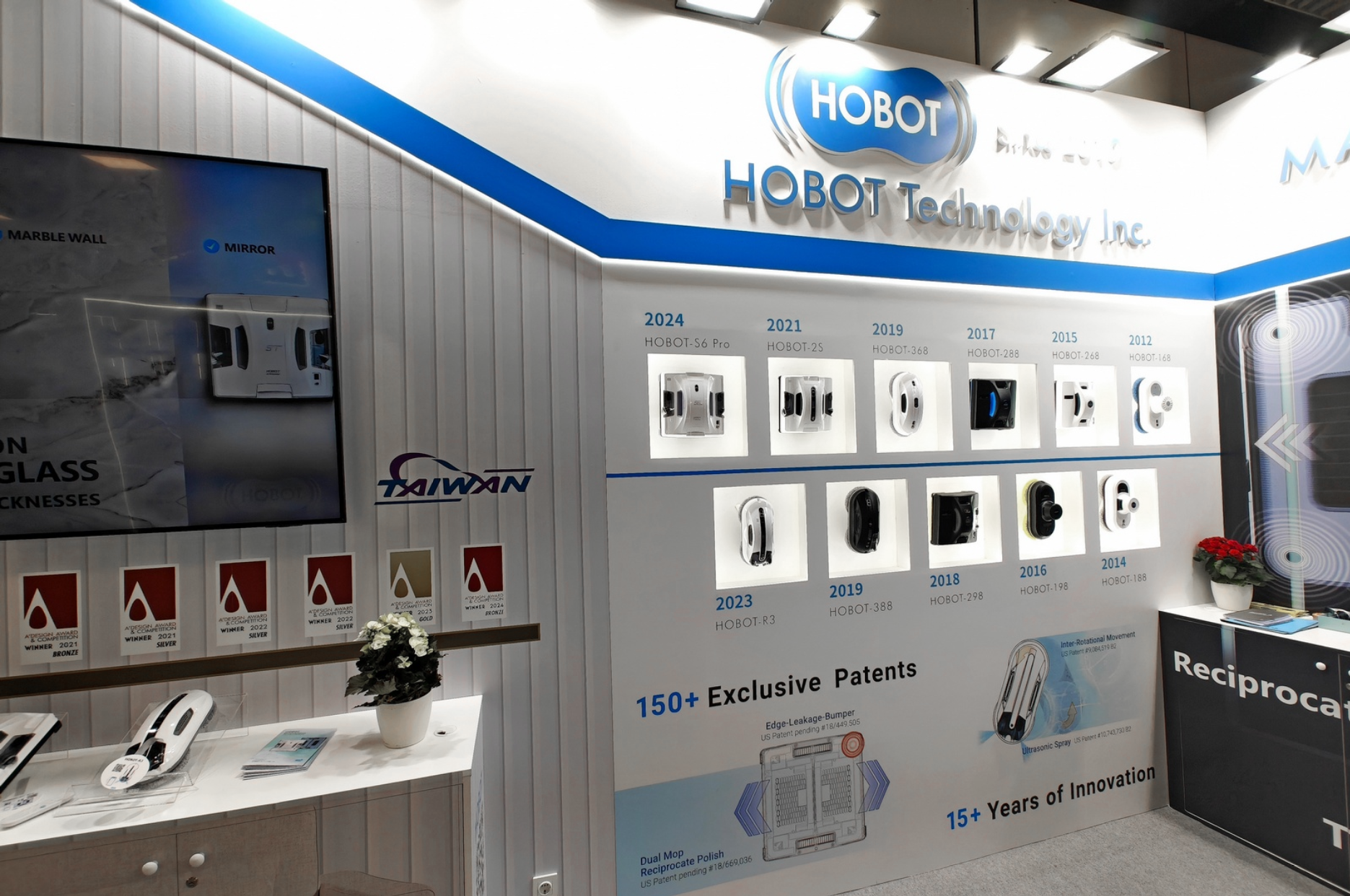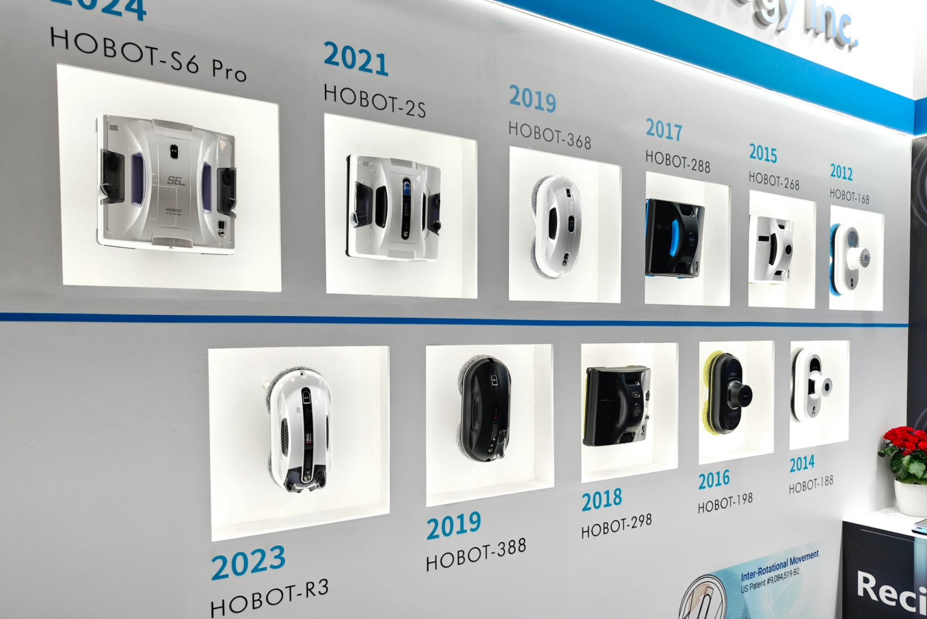 На стенде производитель представил модельный ряд роботов-мойщиков окон, разработанный начиная с 2012 года, продемонстрировав историю развития бренда и сфокусировавшись на современных флагманах.